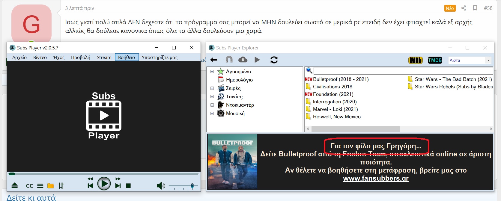 Ευχαριστώ και πάλι, Lobby και με αφορμή το σχόλιό σου θέλω να πω πως ναι, ο subs player έγινε με μεράκι και μακάρι να βρεθεί και κάποιος άλλος με γνώσεις για να γίνει και για android. Να επισημάνω, όμως, κάτι. Δεν είναι εφαρμογή που ανήκει μόνο σε εμένα, ούτε και έχει την αποκλειστικότητα το fansubbers, αλλά είναι μια δημιουργία Ελλήνων ερασιτεχνών υποτιτλιστών (όπως λέει και η σελίδα στο facebook) και ανήκει σε όλους όσους έχουν χόμπι τους τον υποτιτλισμό. Ελπίζω κάποια μέρα να καταλάβουν οι υπόλοιποι υποτιτλιστές πως έχουν ένα εργαλείο στη διάθεσή τους που μπορεί να αναπτύξει τον ερασιτεχνικό υποτιτλισμό (την επισκεψιμότητα στις σελίδες τους, τη συνεννόηση, το ολοκληρωμένο πακέτο της δημιουργίας τους), χωρίς να συνδέονται με άλλους που "τρέφονται" με τη δουλειά τους ή να τους έχουν ανάγκη για να προβληθούν. Αυτός είναι ο βασικός προορισμός του subs player, ασχέτως αν στην πορεία έγινε ένας πλήρης media player που μπορεί ο καθένας να τον έχει για βασικό του, καθώς παίζει τα πάντα (έτσι, για να ευλογούμε τα γένια μας.για την εκπληκτική δουλειά σου